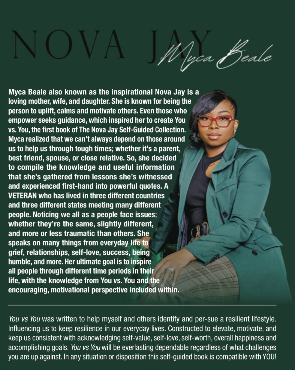 You vs You is an self-guided book intended to instruct readers on how to solve personal problems. An everyday book of quotes and affirmations designed to be a tool throughout every step of your journey to a life of success and satisfaction. You vs.You mission is to help people strengthen their ability to be resilient and help recover or remain unaffected from the difficulties faced and everyday life. It will empower you in the time of doubt, loneliness and unfaithfulness; as well as keep you motivated during highlights of your life.